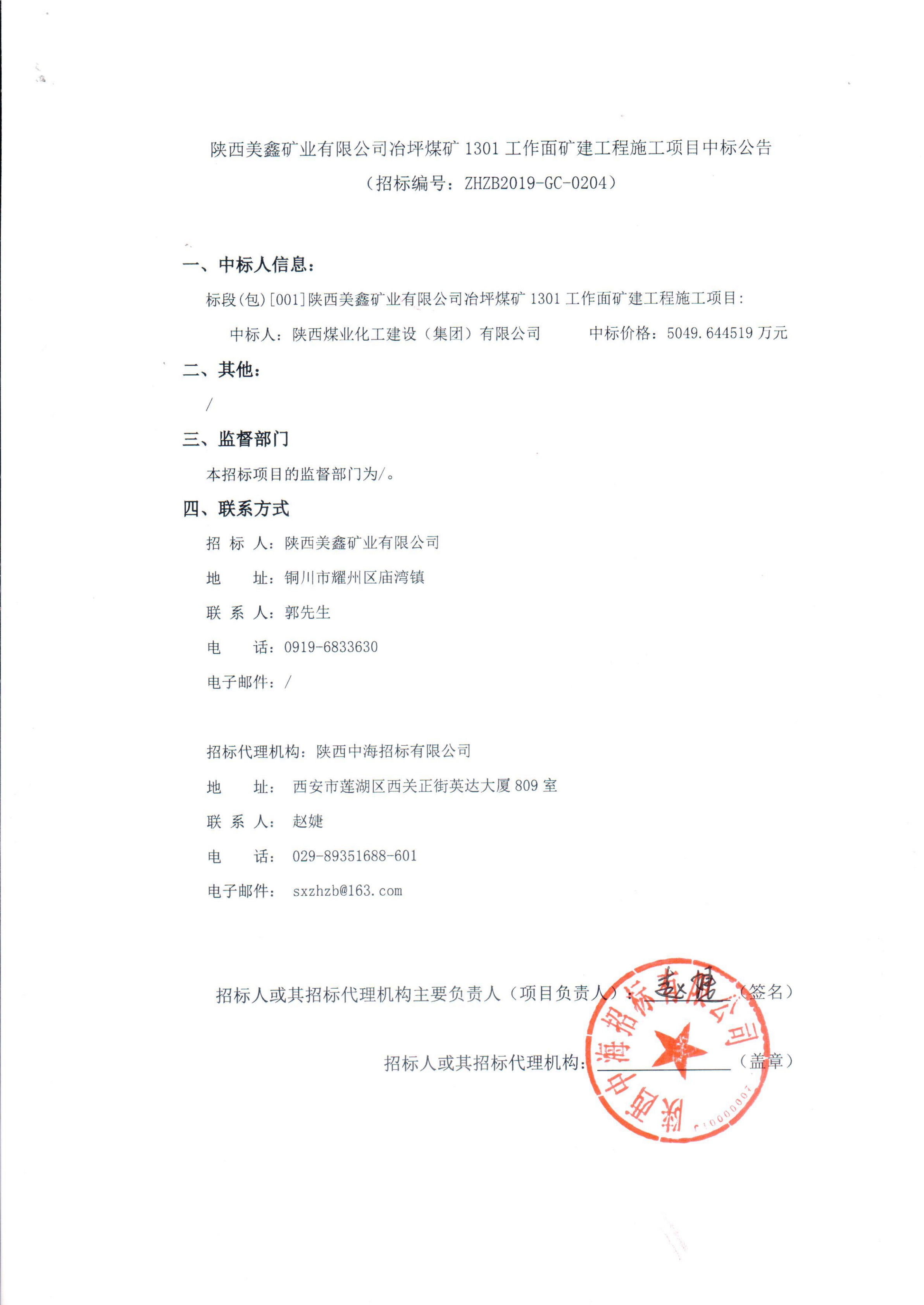 陕西美鑫矿业有限公司冶坪煤矿1301工作面矿建工程施工项目